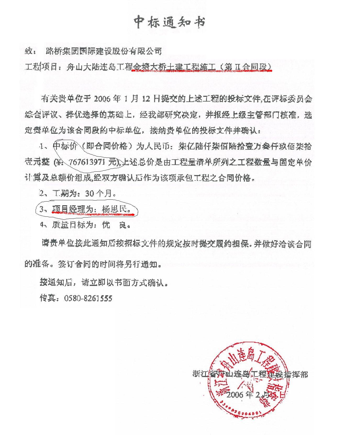金塘大橋第Ⅱ合同段項(xiàng)目一度出現(xiàn)三個(gè)不同的項(xiàng)目經(jīng)理。根據(jù)當(dāng)初“指揮部”發(fā)給路橋建設(shè)的中標(biāo)通知書顯示,項(xiàng)目經(jīng)理為楊思民。