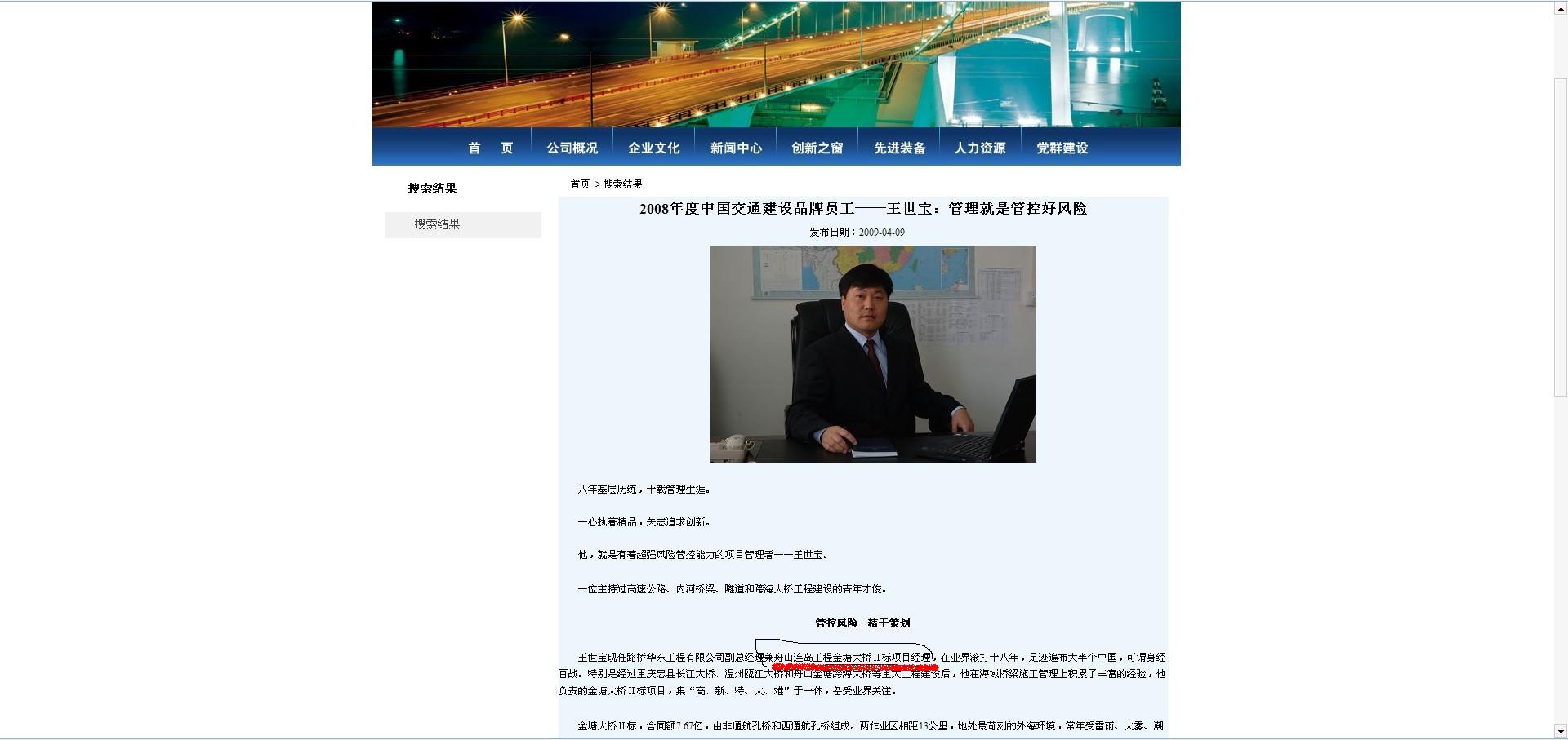 記者從路橋建設(shè)的網(wǎng)站上獲悉,現(xiàn)任路橋華東黨委書記王世寶的個(gè)人履歷介紹中顯示:“王世寶憑借在海域橋梁施工管理上積累的豐富經(jīng)驗(yàn),擔(dān)任金塘大橋第Ⅱ合同段項(xiàng)目經(jīng)理。”